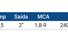 Bombas centrífugas de média capacidade para pequenas e médias aplicações agrícolas. Impulsor aberto que permite a passagem de pequenos sólidos (Ø máx 10 mm). Corpo bomba ferro fundido Suporte do motor ferro fundido Impulsor noril® ou latão Vedação mecânica cerâmica-grafite-NBR Veio do motor aço inoxidável AISI 416 Temperatura do líquido impulsor noril® 0 – 50…